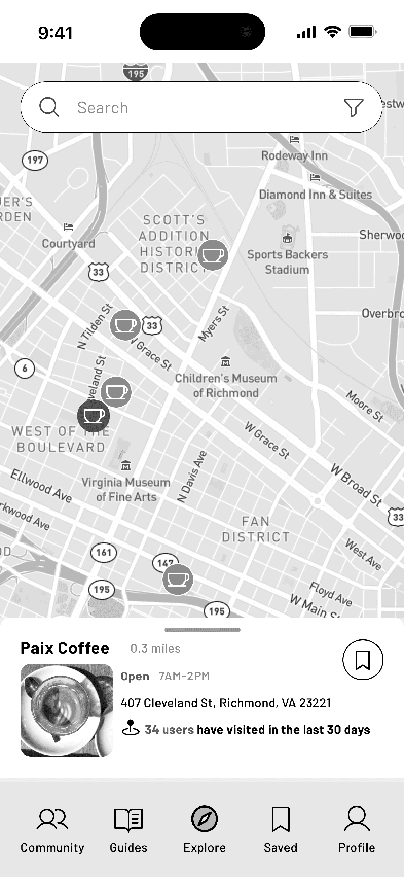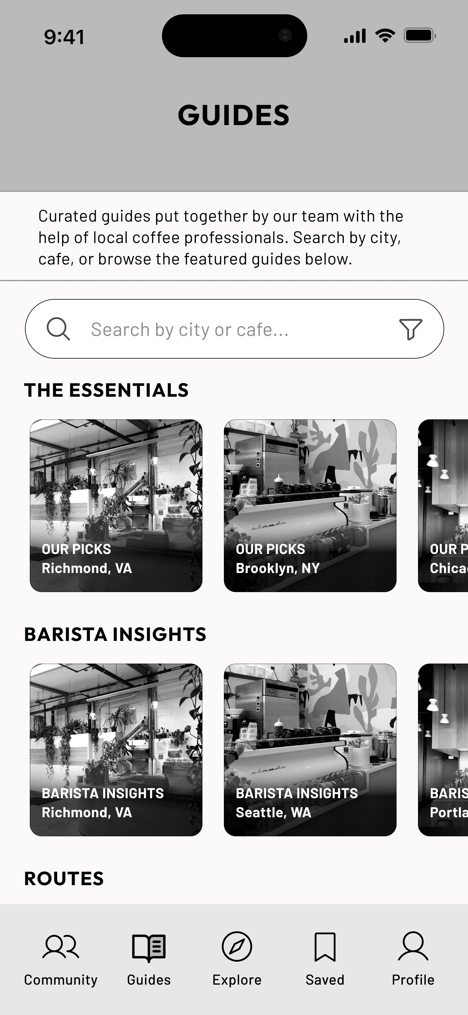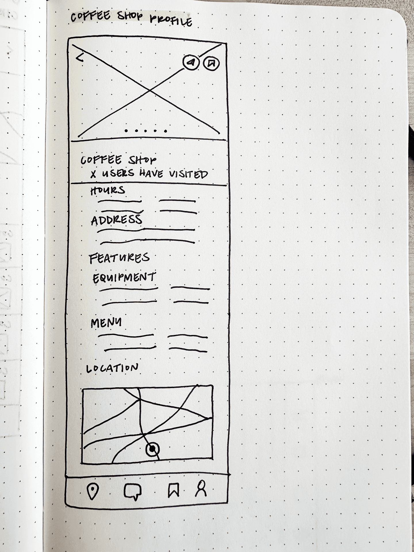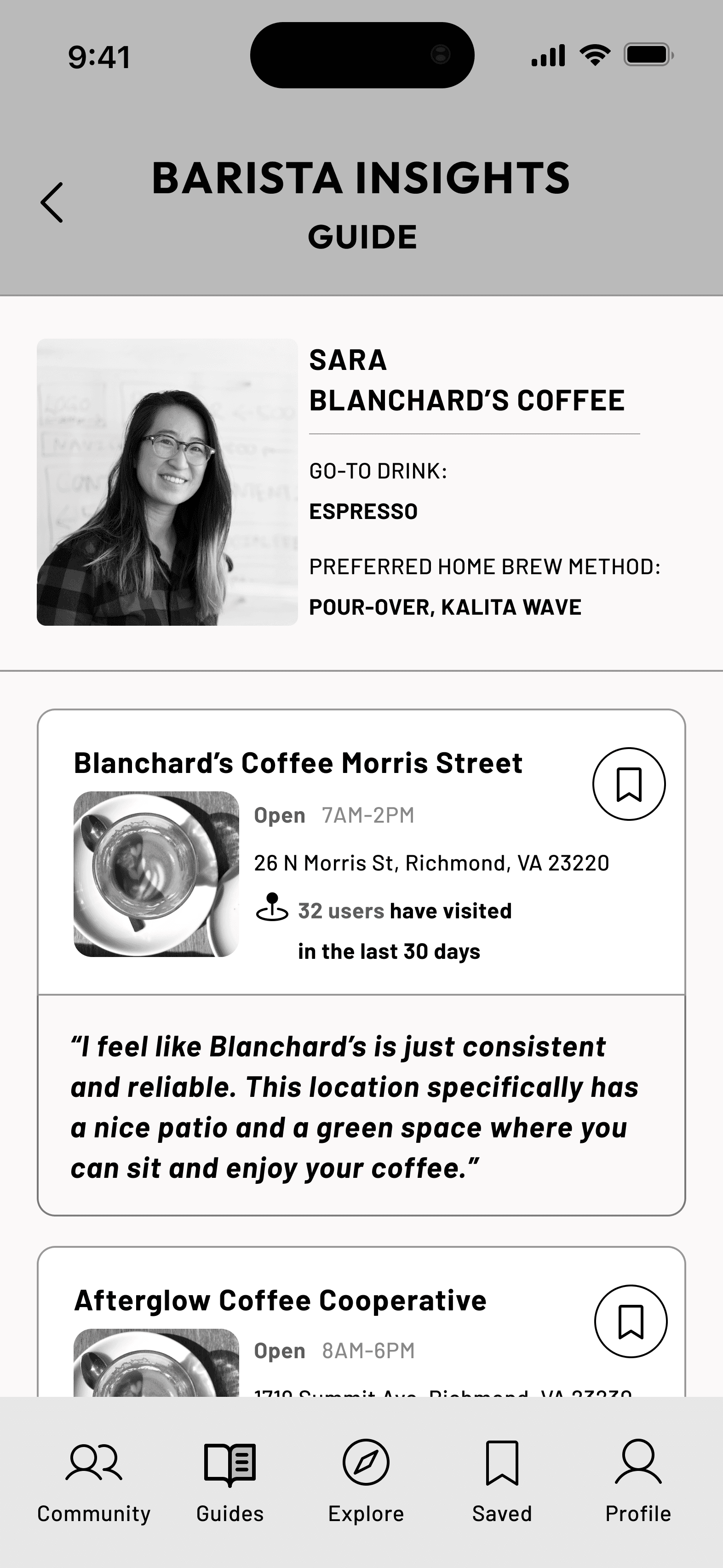 I wanted to establish familiar design patterns while still creating something that felt personable. The personable touch came with the idea of guides and the fact that they are curated by not only the Dabbio team, but also baristas, locals and other coffee professionals. From the beginning, I knew Dabbio needed something to set it apart from other coffee shop discovery apps, and I believe I found that with the honest, community-driven approach presented throughout the design.