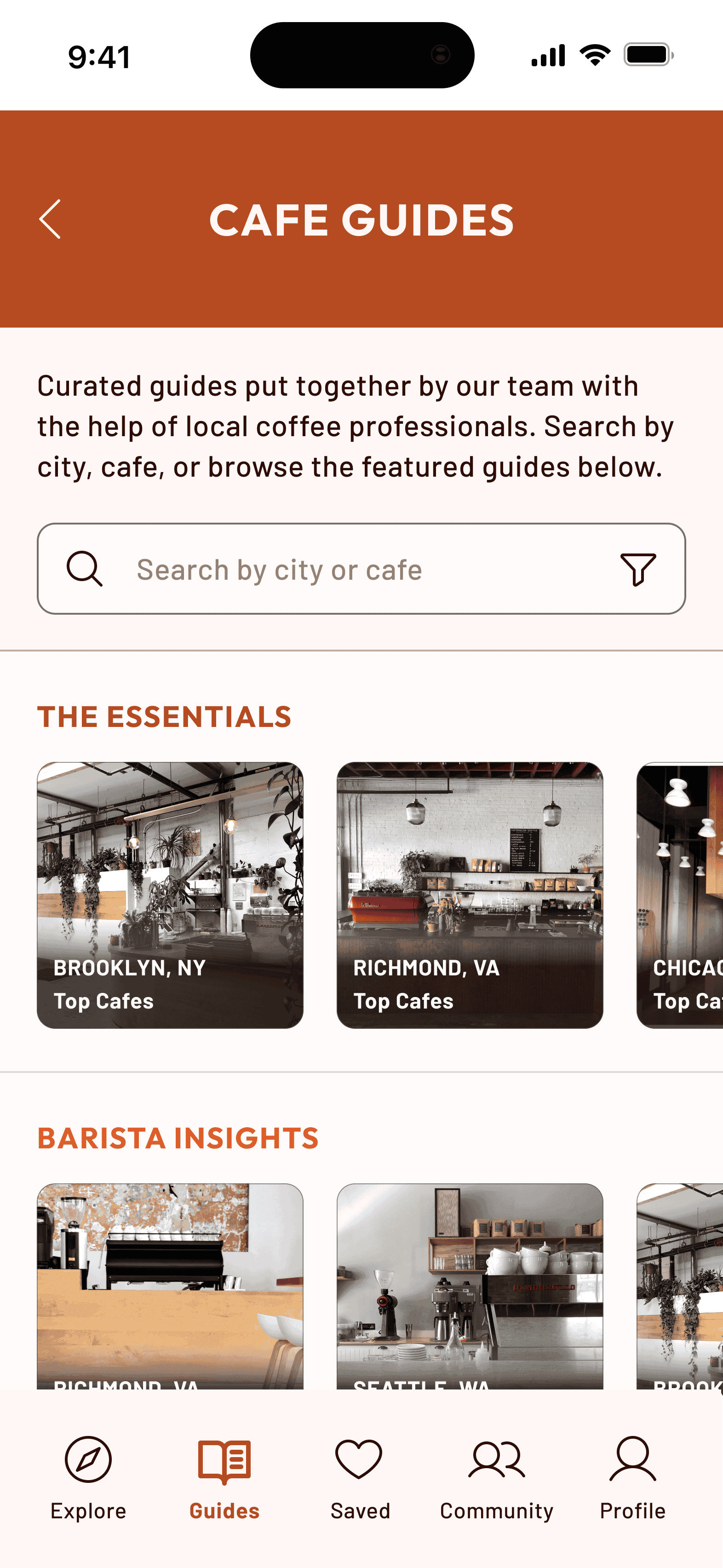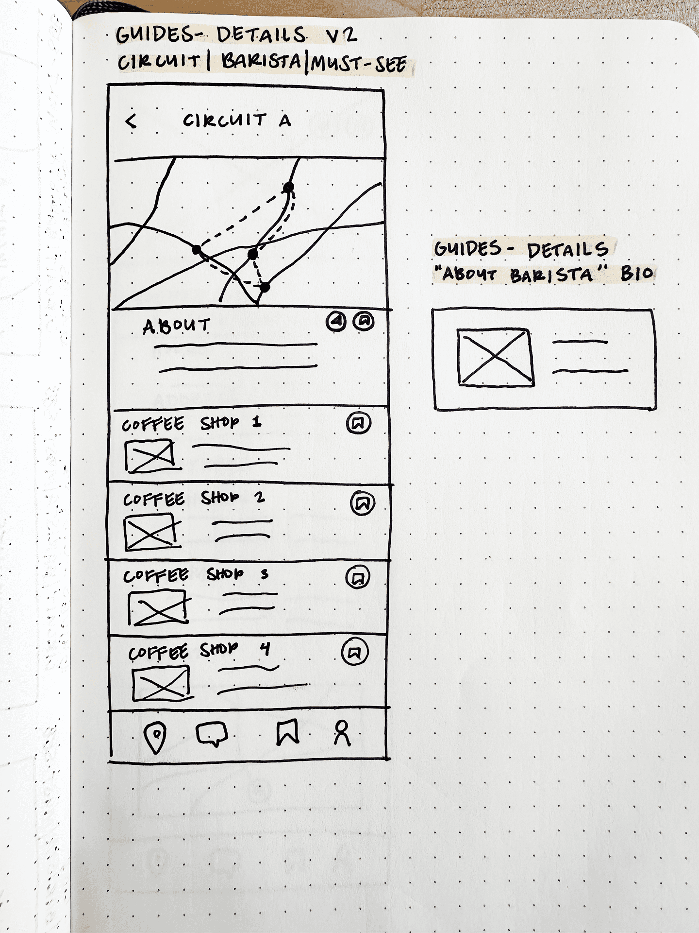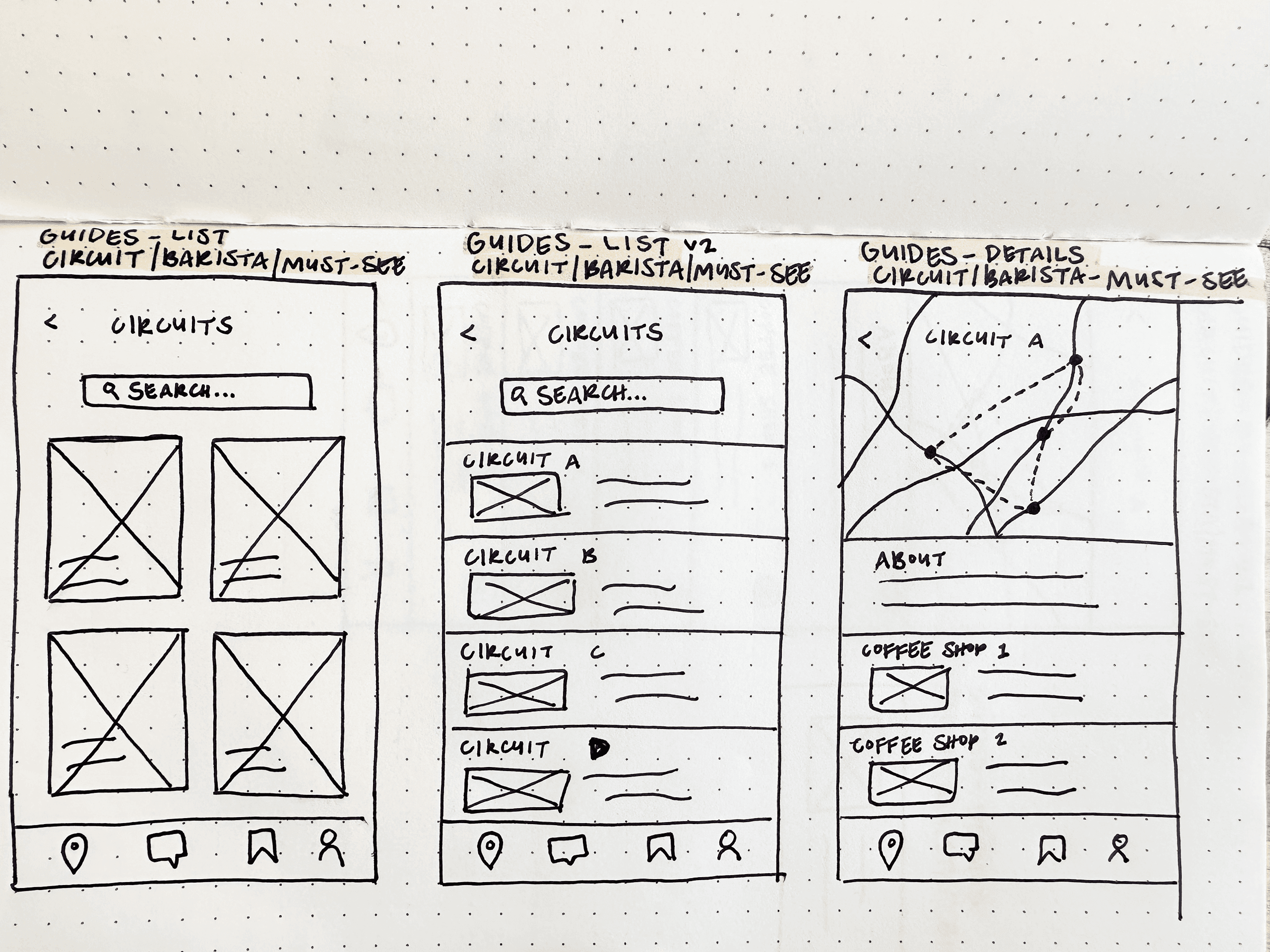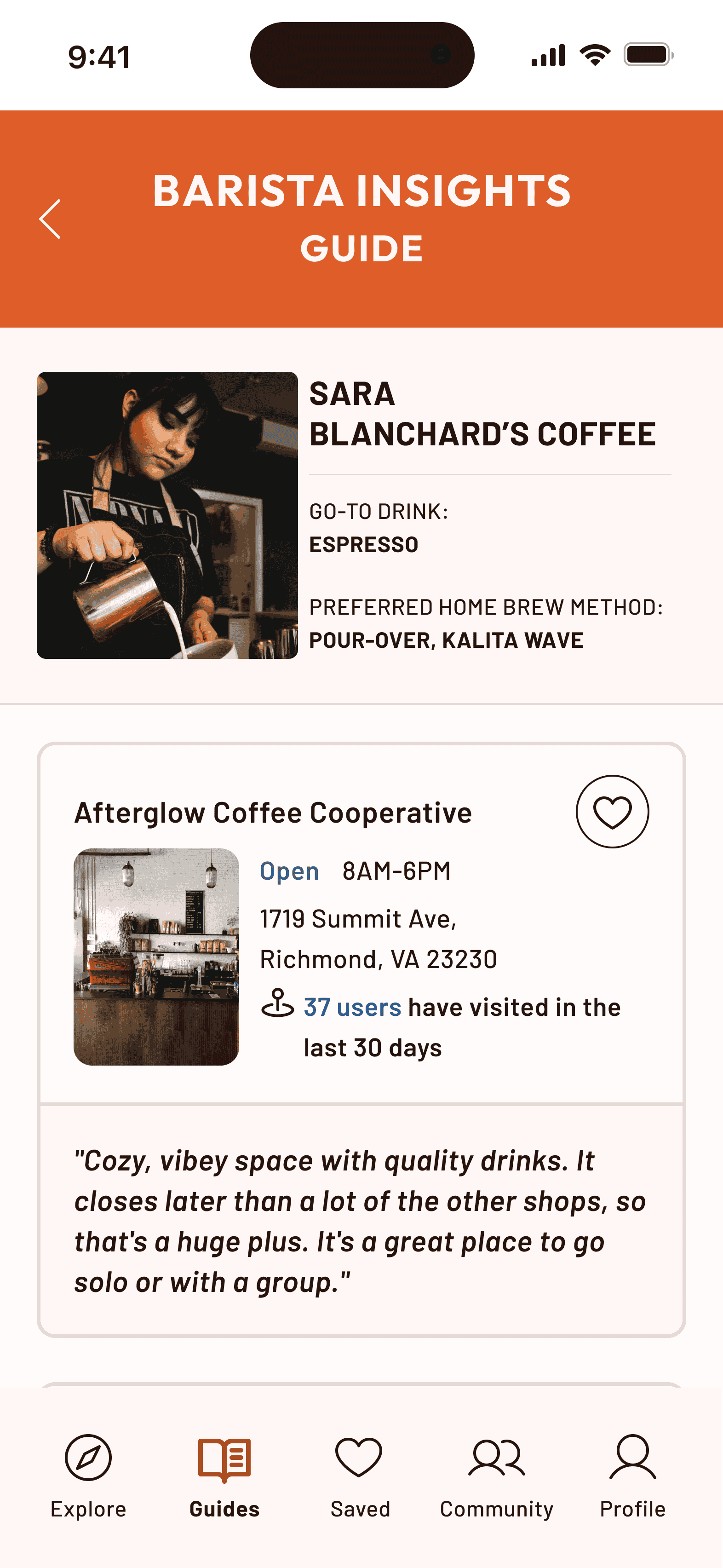 I wanted to establish familiar design patterns while still creating something that felt personable. The personable touch came with the idea of guides and the fact that they are curated by not only the Dabbio team, but also baristas, locals and other coffee professionals. From the beginning, I knew Dabbio needed something to set it apart from other coffee shop discovery apps, and I believe I found that with the honest, community-driven approach presented throughout the design.