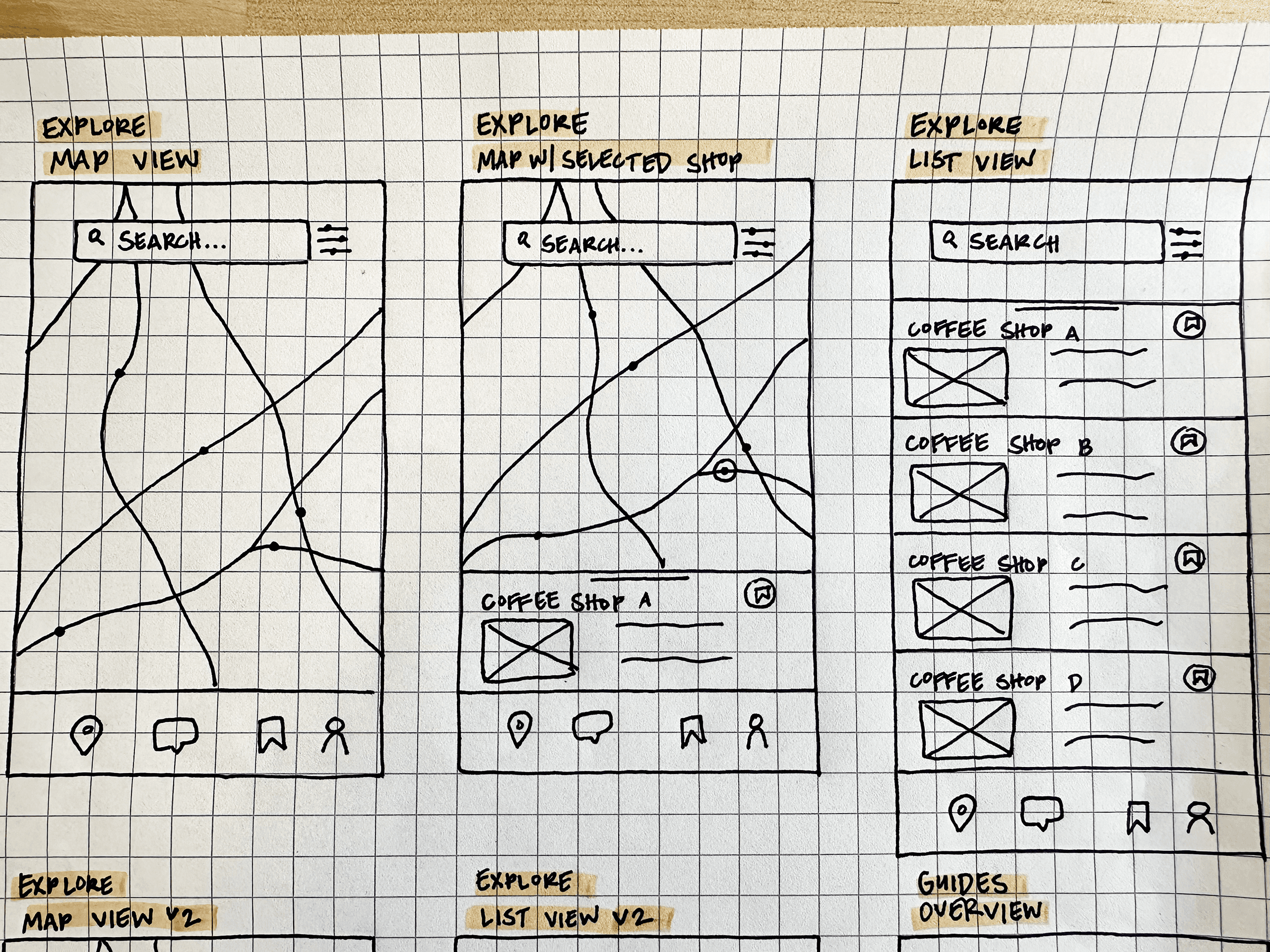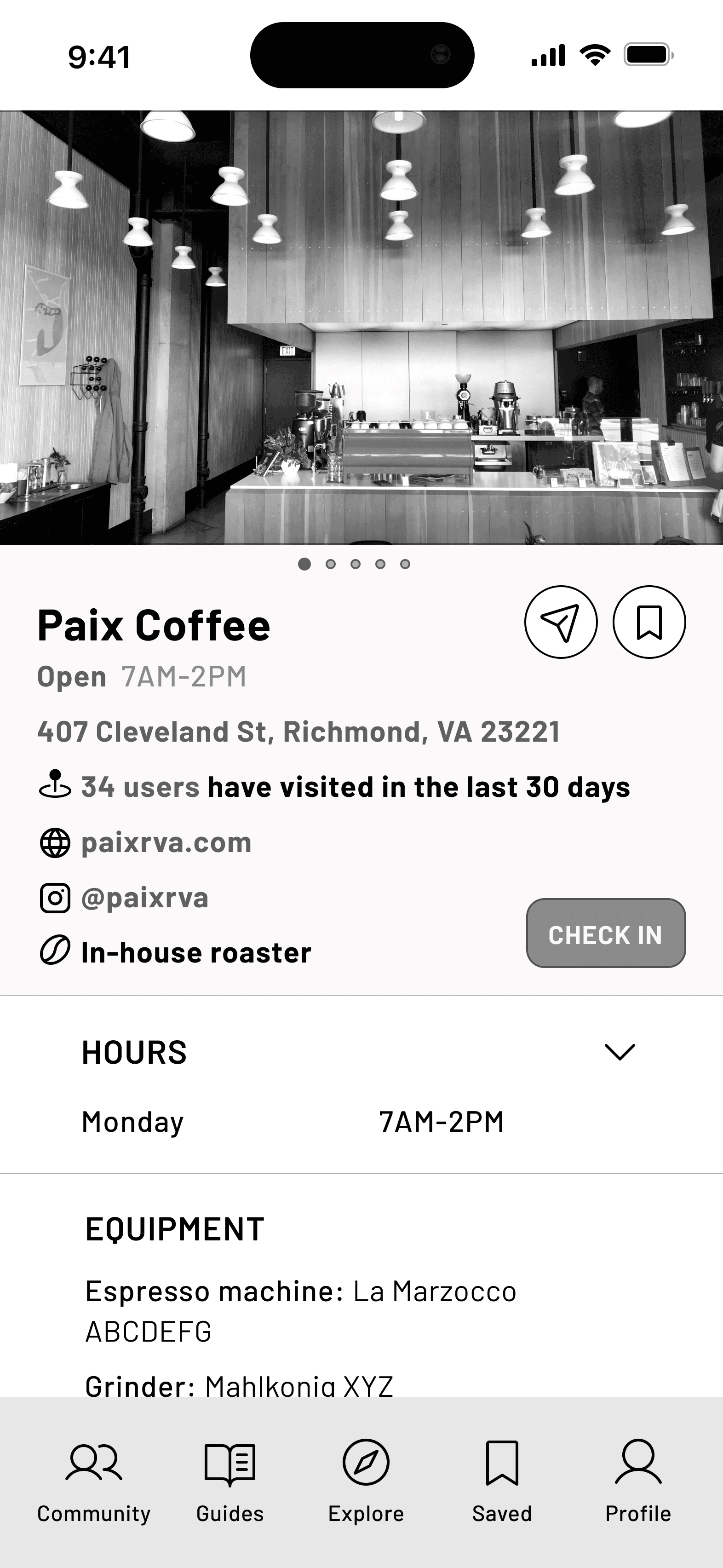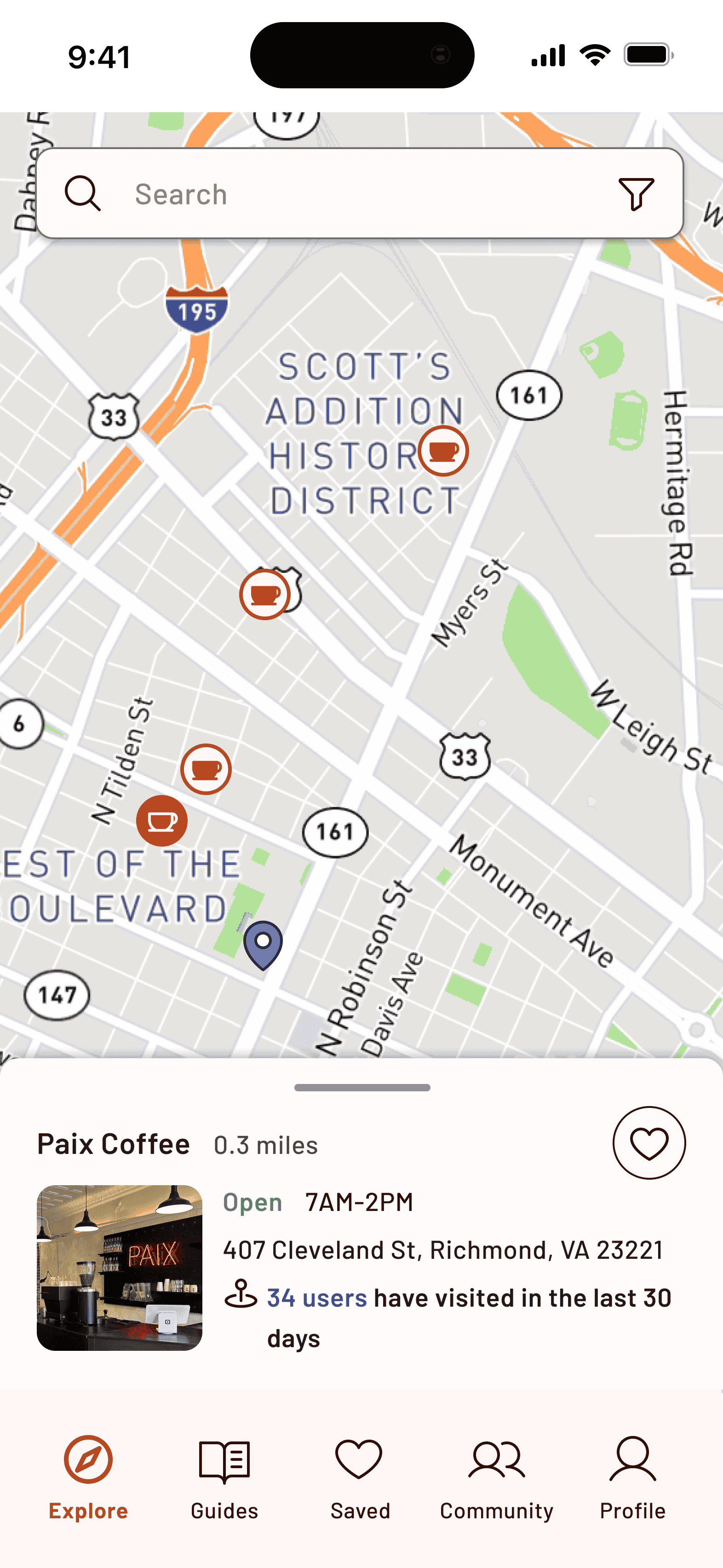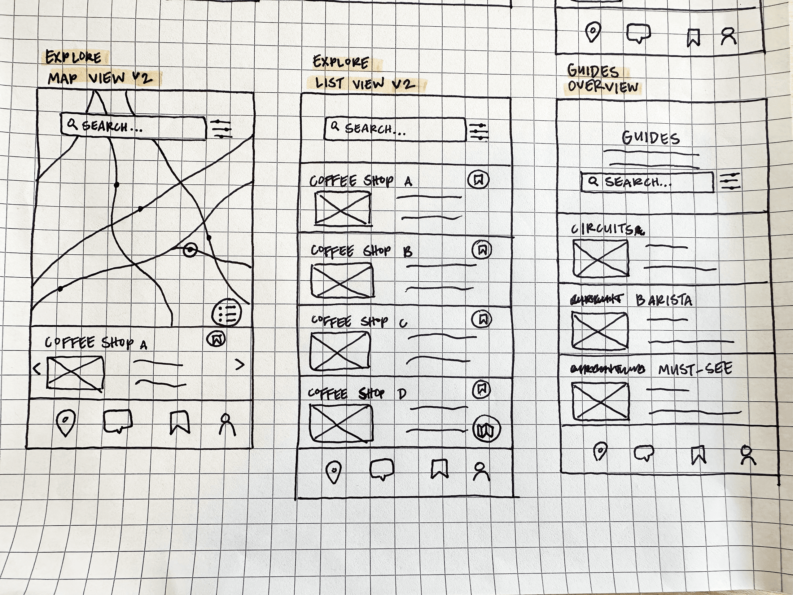 I wanted to establish familiar design patterns while still creating something that felt personable. The personable touch came with the idea of guides and the fact that they are curated by not only the Dabbio team, but also baristas, locals and other coffee professionals. From the beginning, I knew Dabbio needed something to set it apart from other coffee shop discovery apps, and I believe I found that with the honest, community-driven approach presented throughout the design.