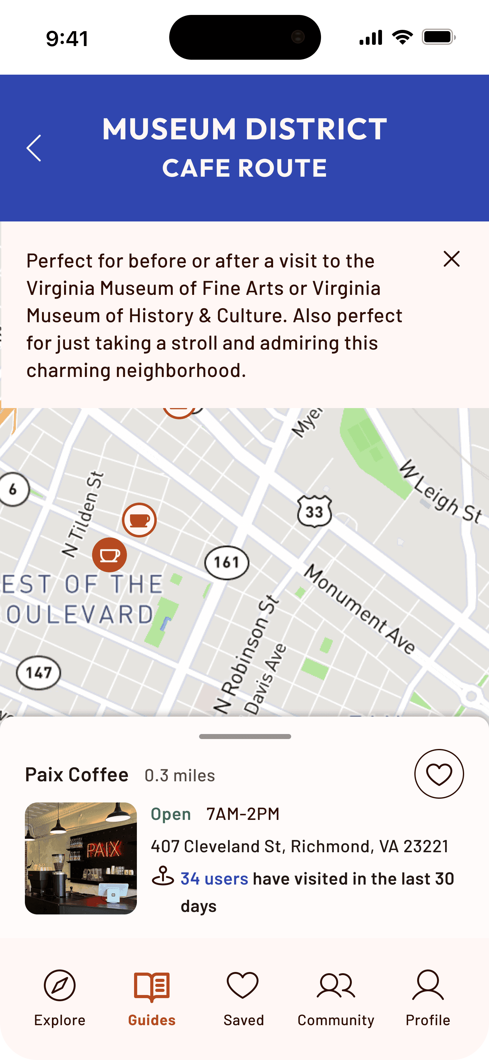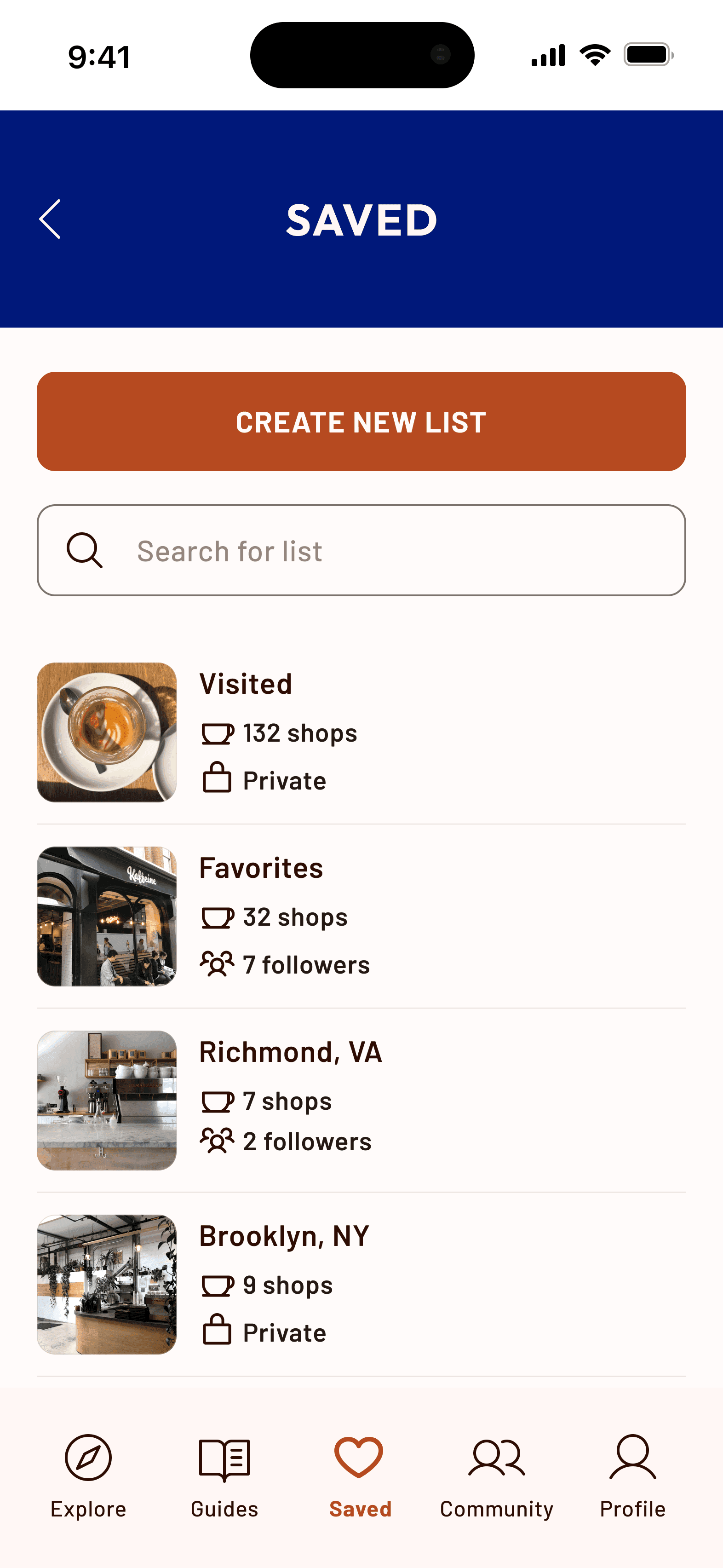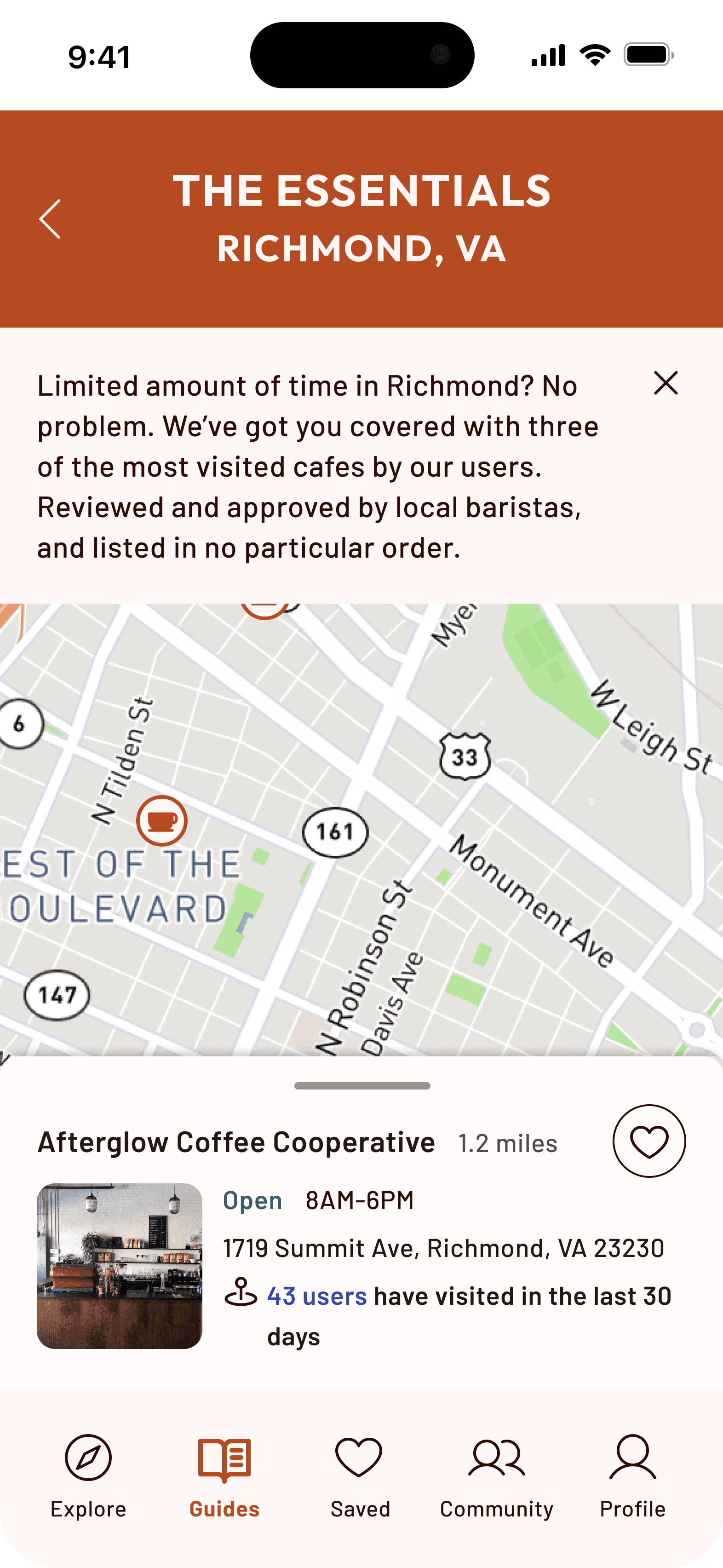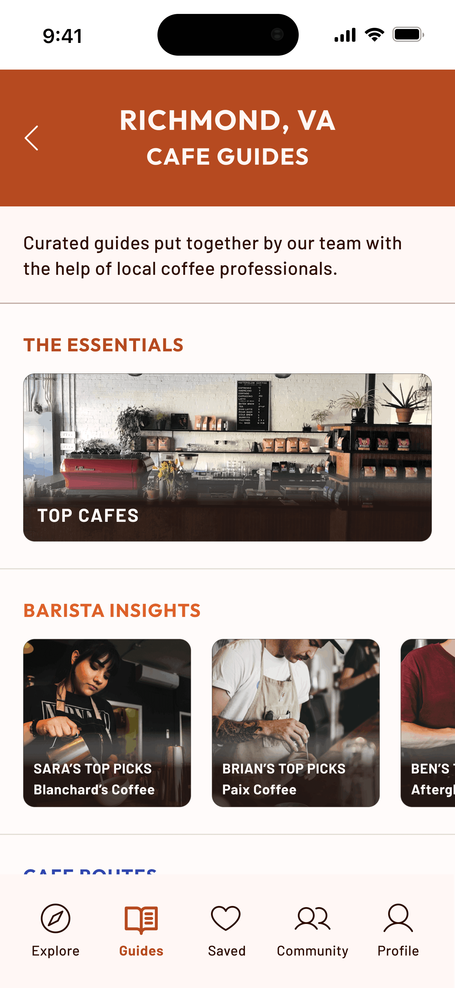 I wanted to establish familiar design patterns while still creating something that felt personable. The personable touch came with the idea of guides and the fact that they are curated by not only the Dabbio team, but also baristas, locals and other coffee professionals. From the beginning, I knew Dabbio needed something to set it apart from other coffee shop discovery apps, and I believe I found that with the honest, community-driven approach presented throughout the design.