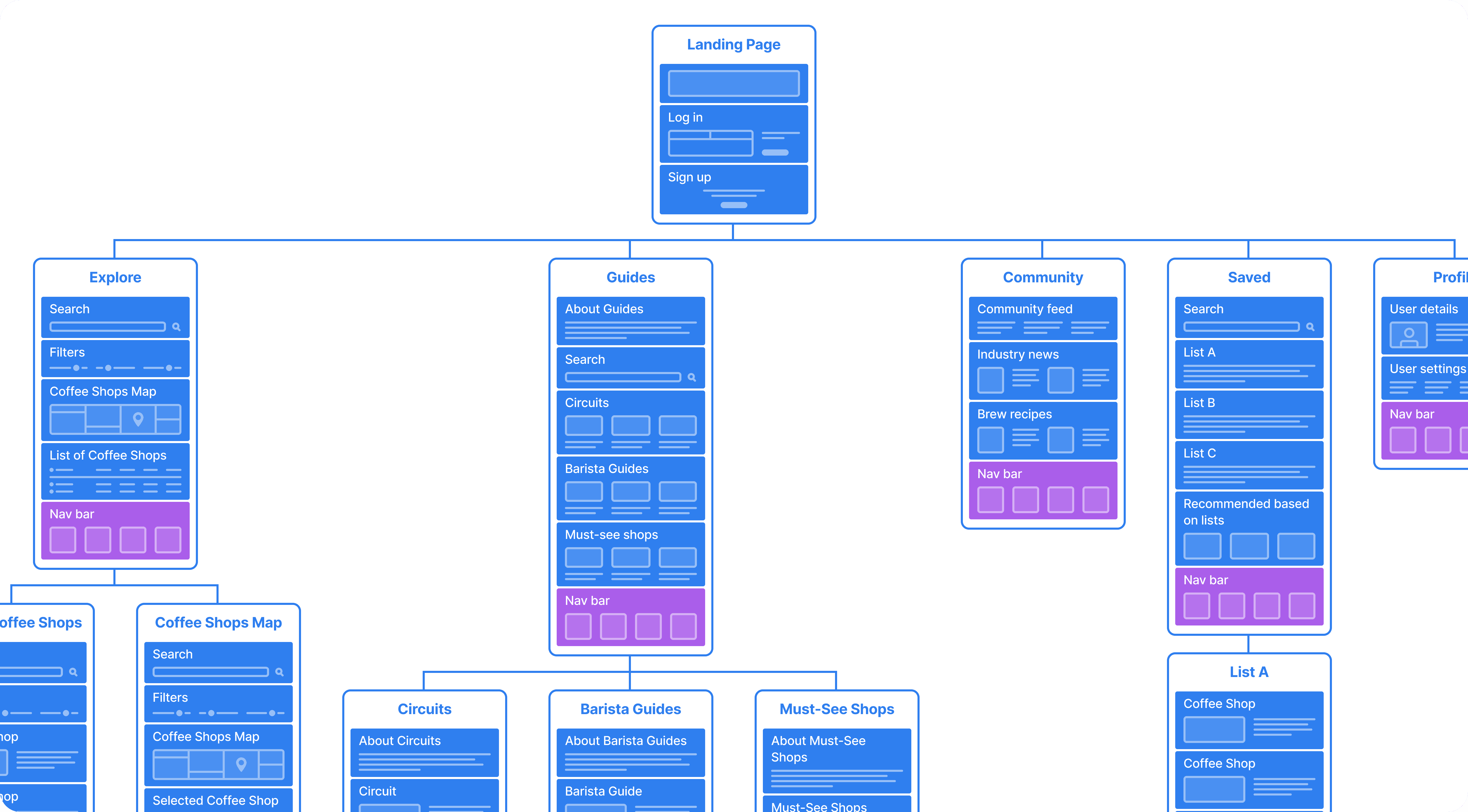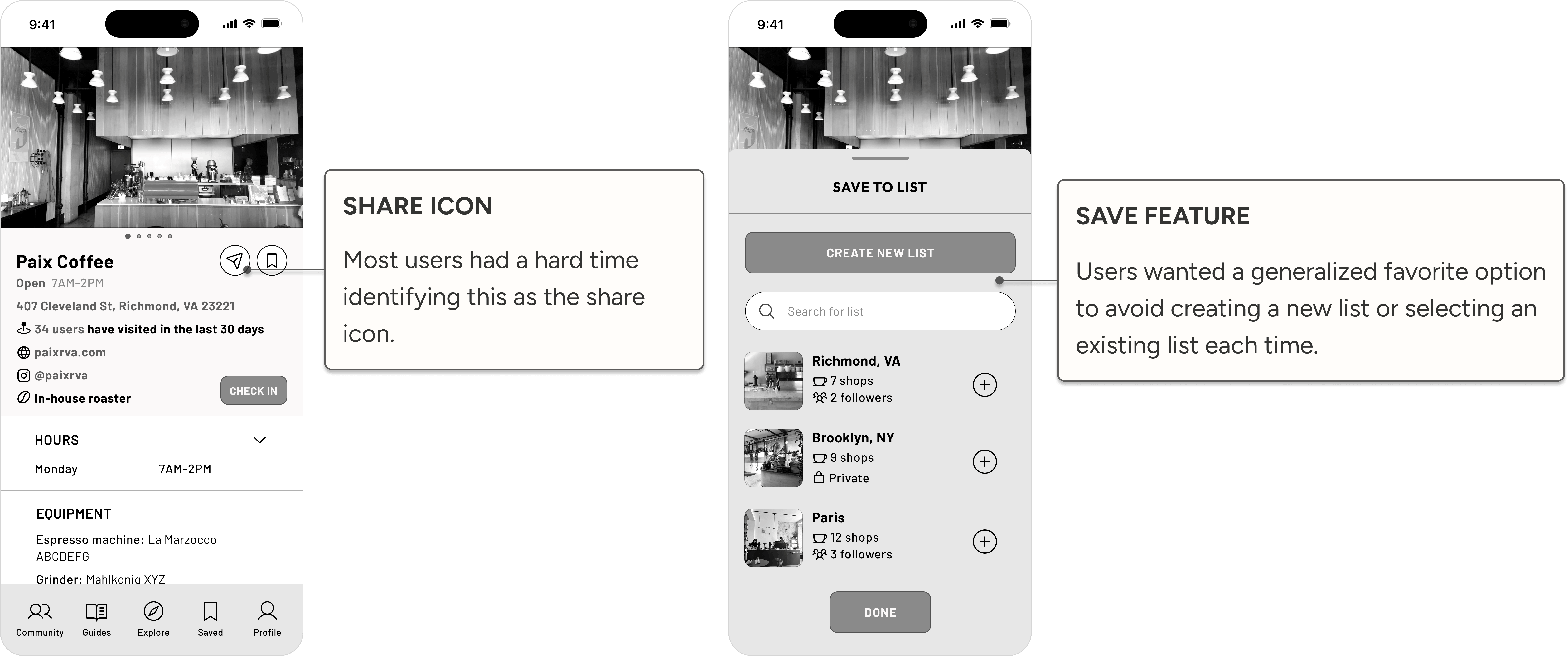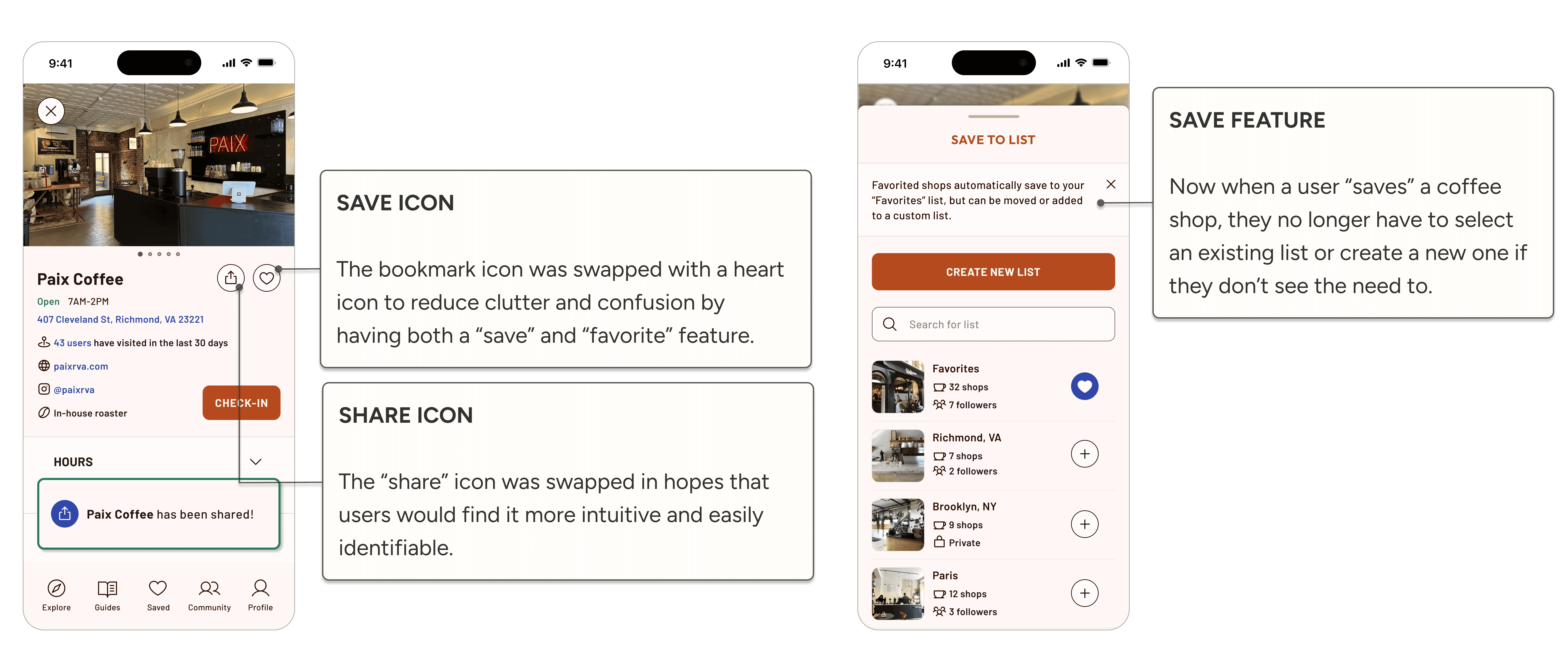 I mapped out two user flows to show the movement through the tasks of saving a coffee shop and sharing a coffee shop profile.