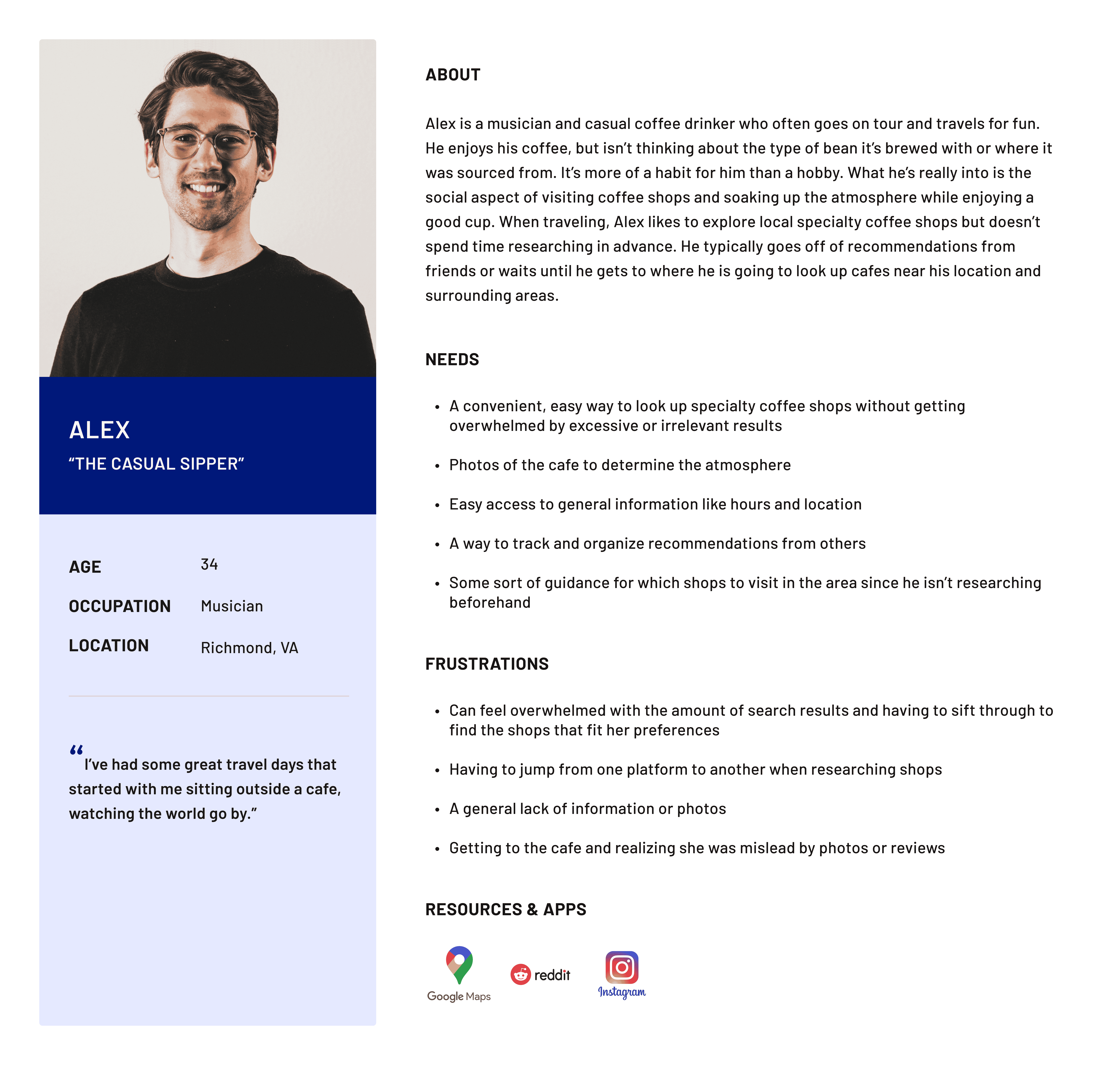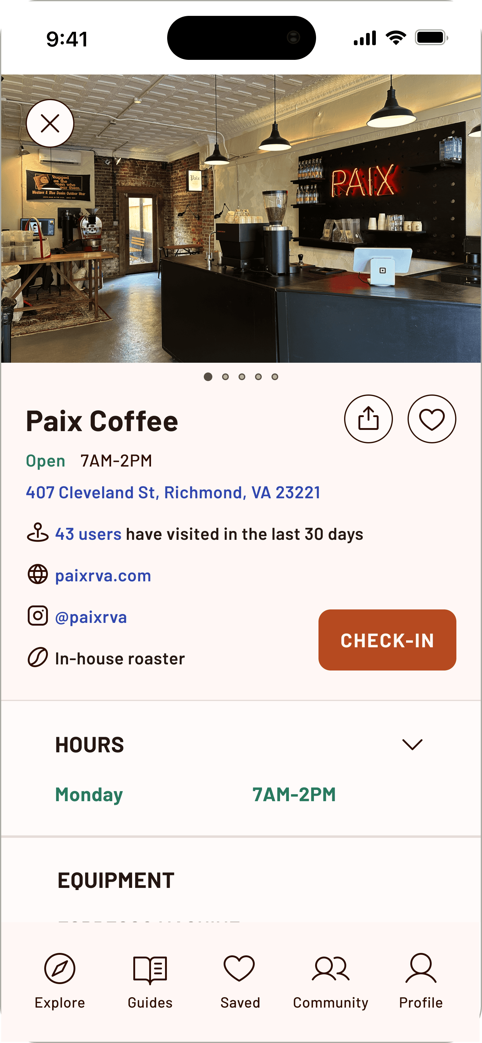 Coffee enthusiasts find themselves sifting through Google or Apple Maps when traveling, but find it hard to separate specialty shops from average shops. If research is done beforehand, they may find themselves sifting through blogs and relying on word of mouth recommendations since they tend to be more trustworthy than an online review. The specialty coffee community is missing out on a deeper connection that elevates the enthusiast's experience, while increasing shop credibility and visibility.
