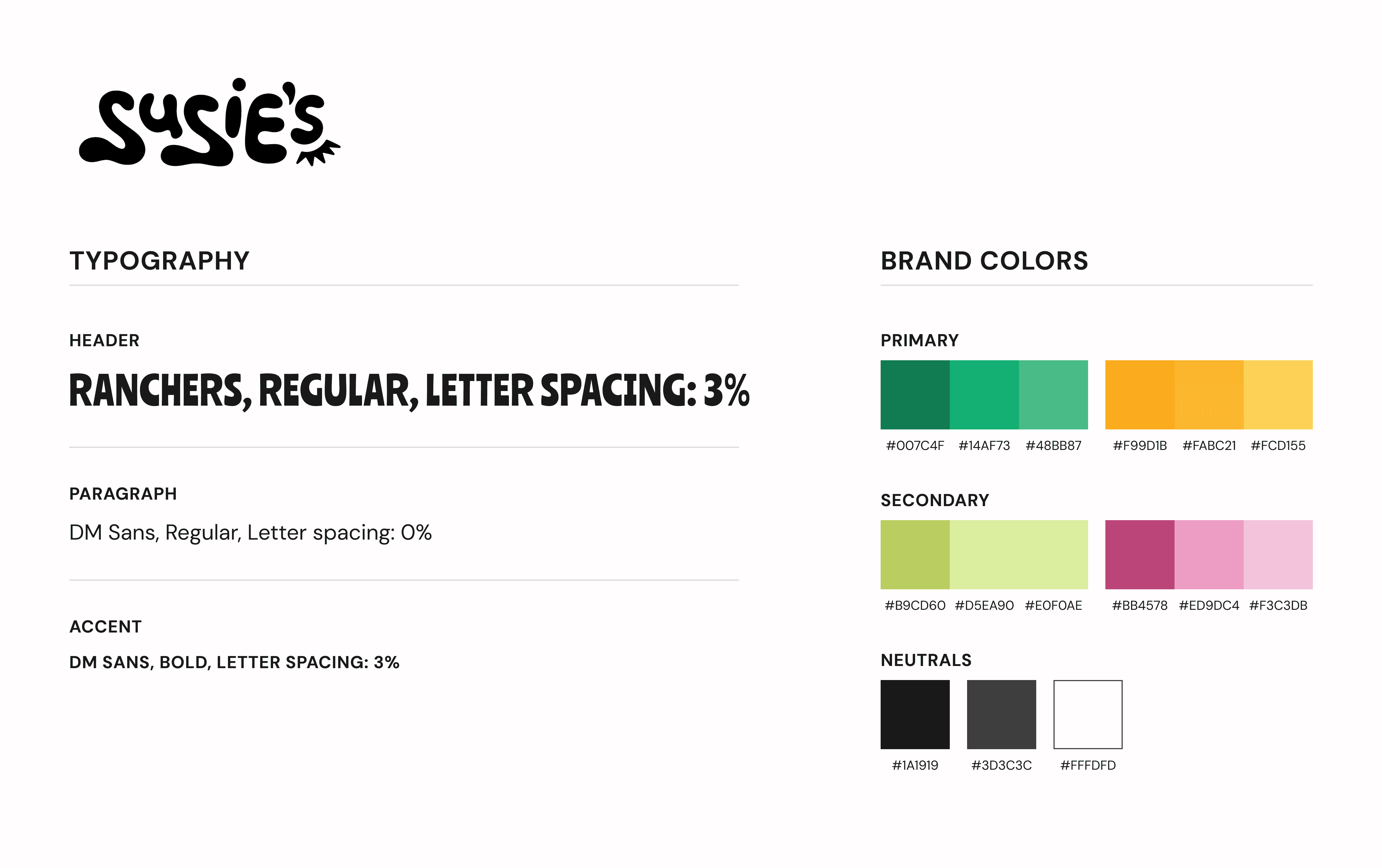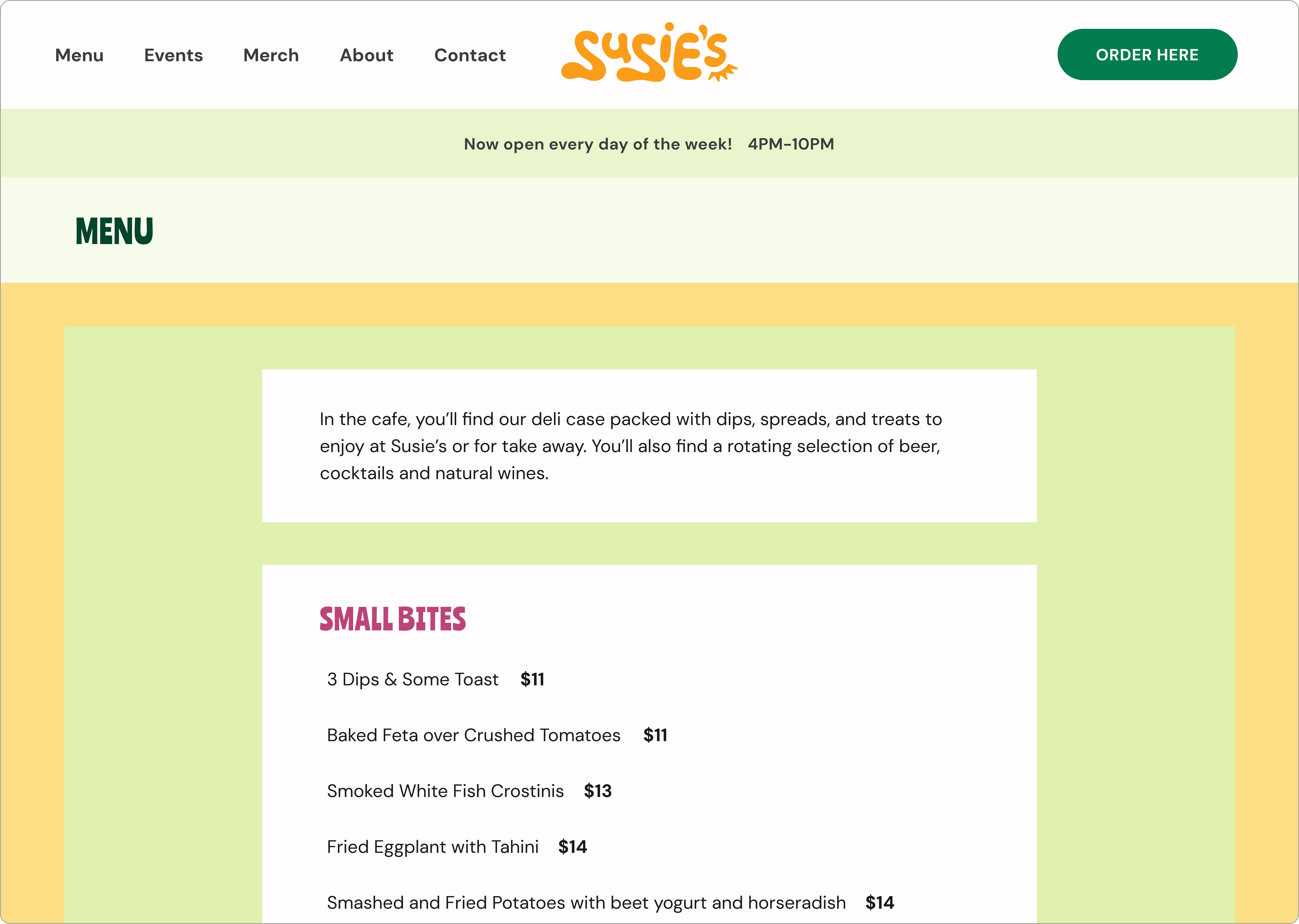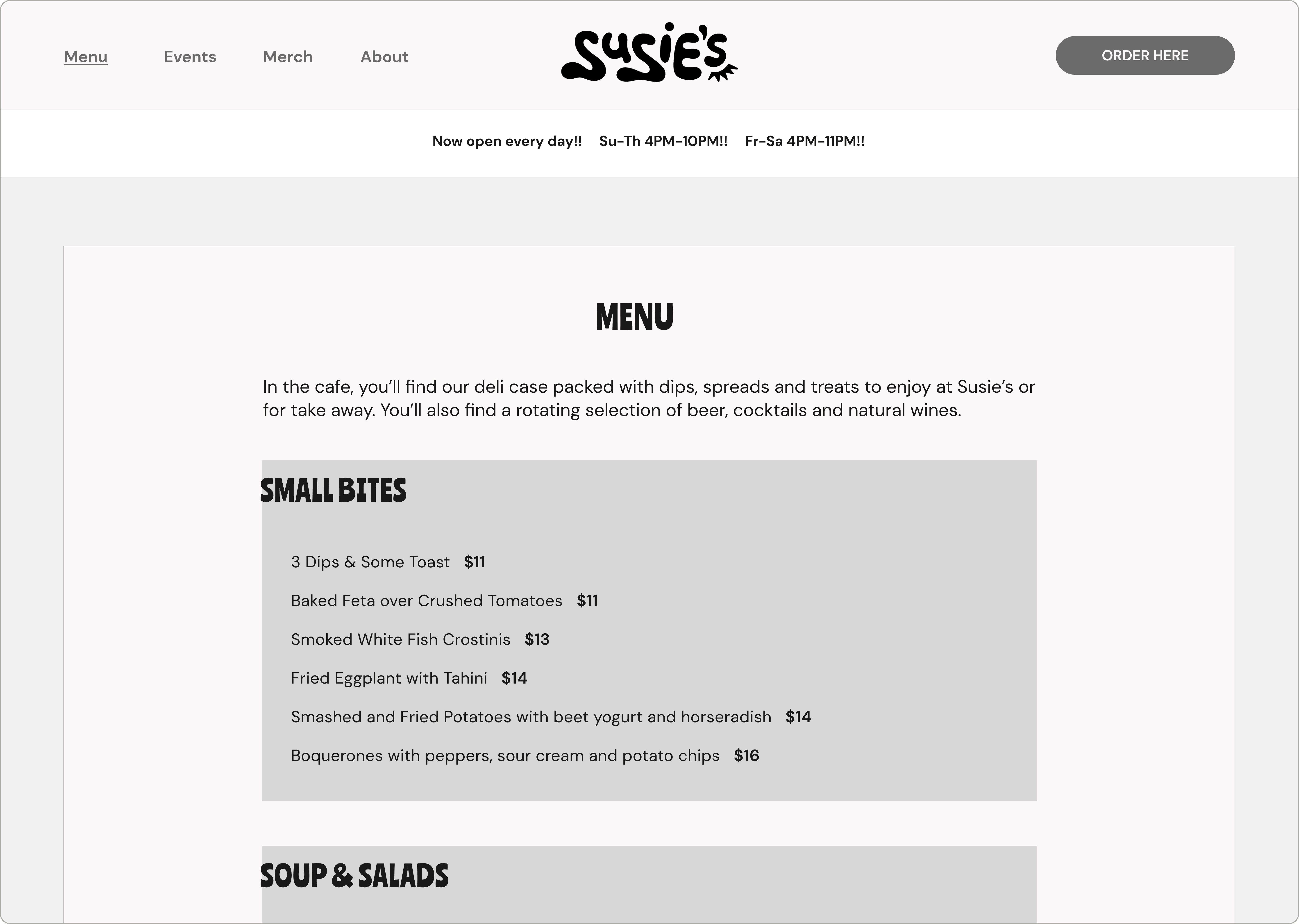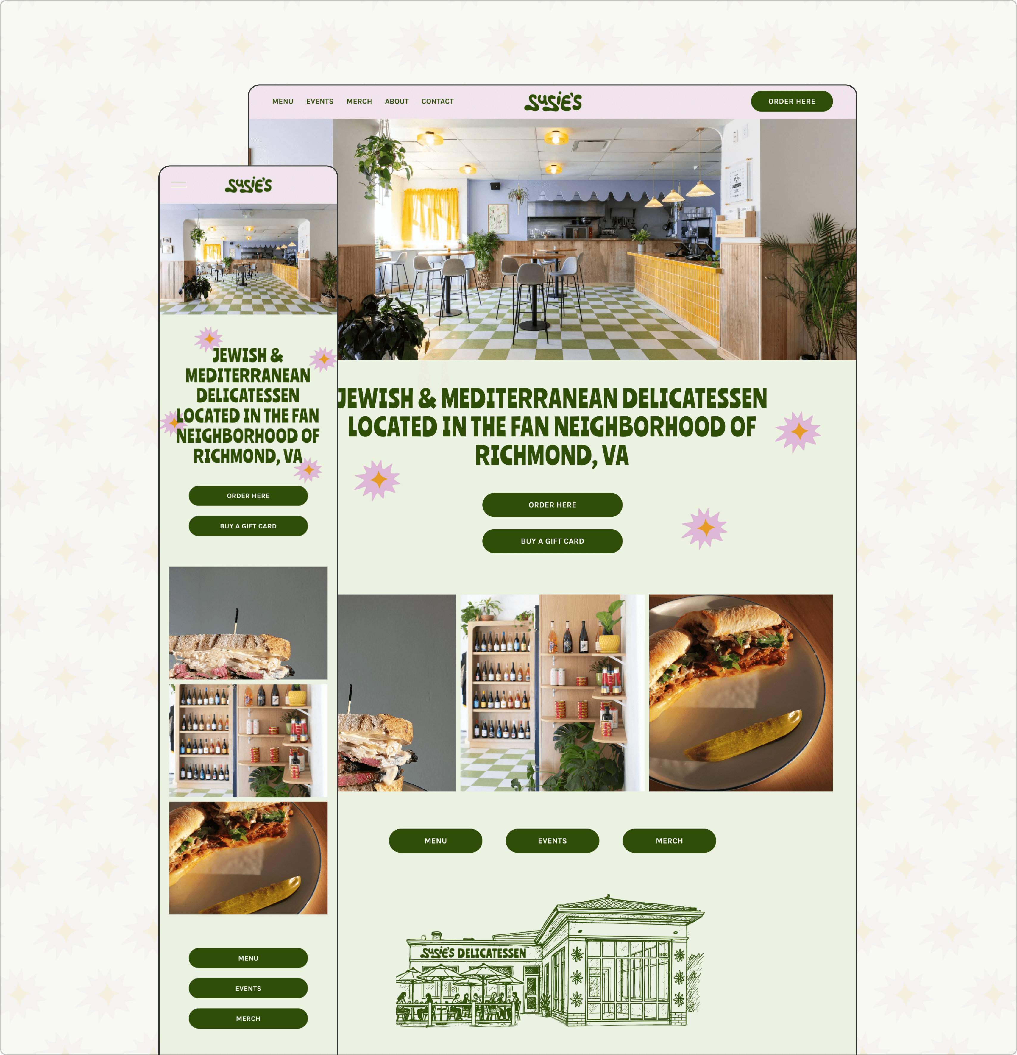 Susie's had the social media following, but with the opening of a brick-and-mortar, they needed a digital space that was accessible to everyone. By relying on word of mouth to reach people who didn't have an Instagram account, their reach could only go so far. They needed a space to house essential information, streamline online ordering, and reflect the the vibe of this beloved local spot.