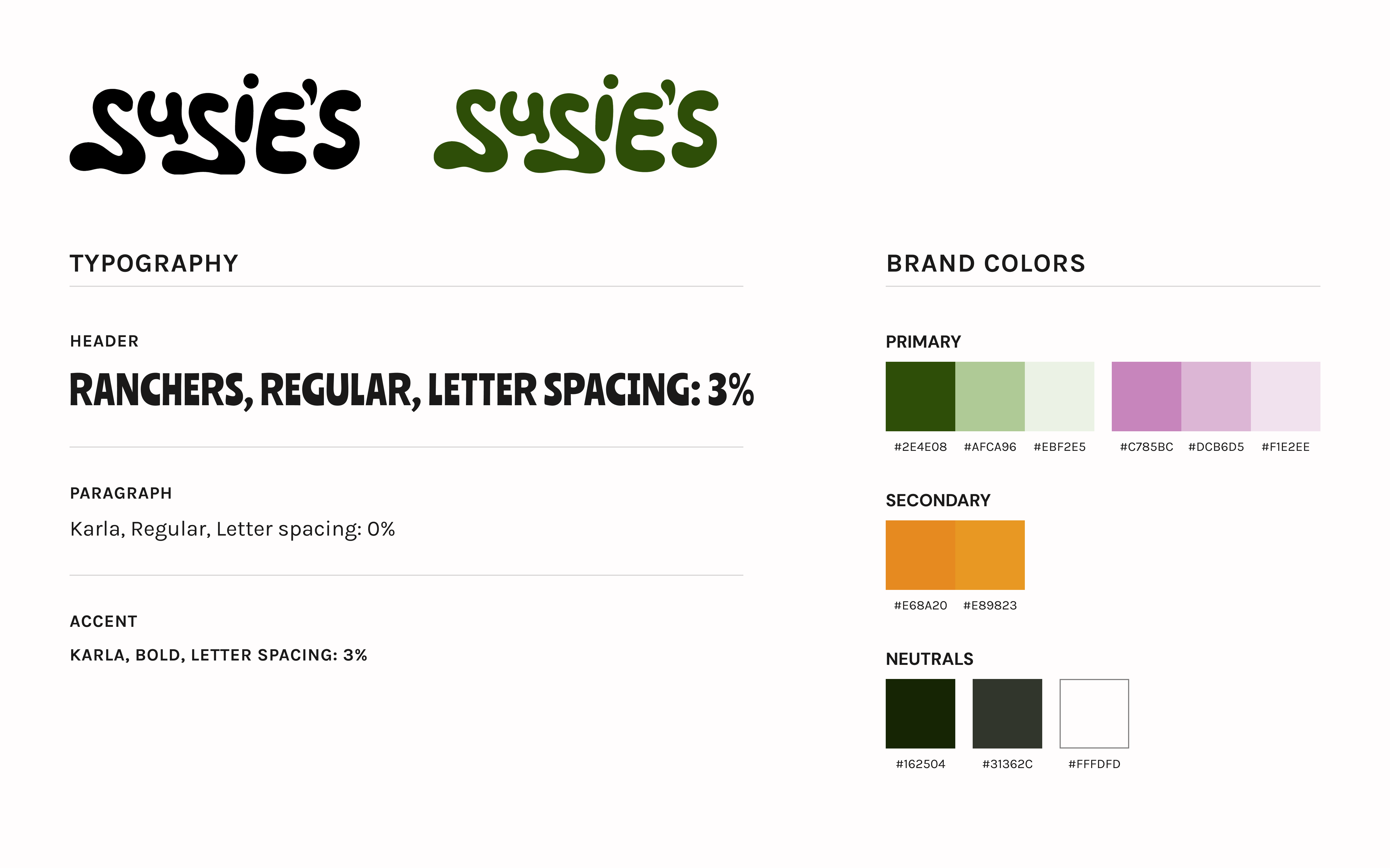 A website that delivers an accessible and delightful experience with simple user flows for ease of navigation, a clear call-to-action for placing orders online, and a strong connection to Susie’s brand and values.