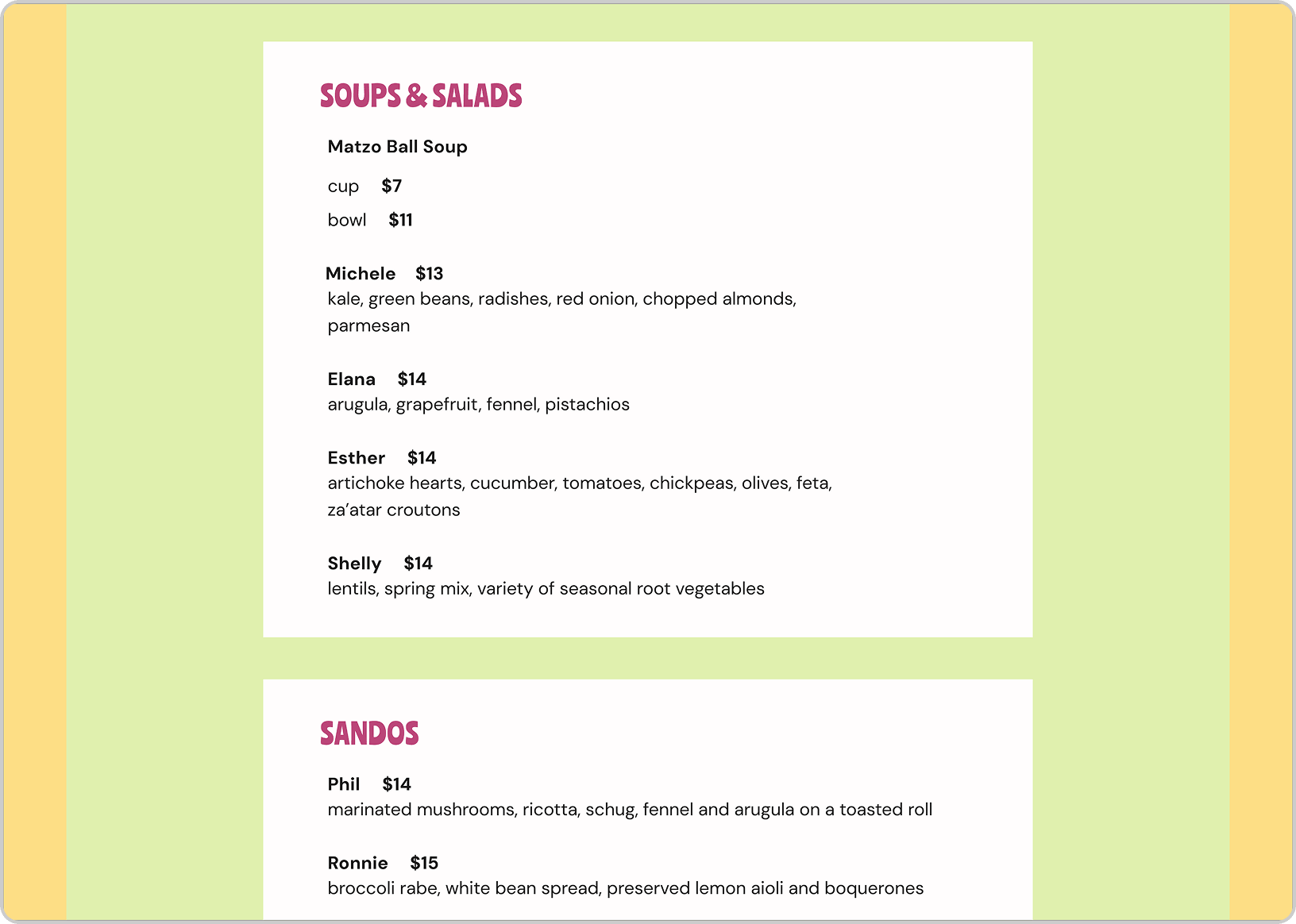 While moving from mid-fidelity to high-fidelity, I was informed that the lunch and dinner menus had been combined into one, which meant more screen real estate. I used auto-layout to efficiently experiment with different menu layouts. This is also where I made the decision to change the alignment of the menu headers after receiving quite a bit of feedback from testing and a group critique.